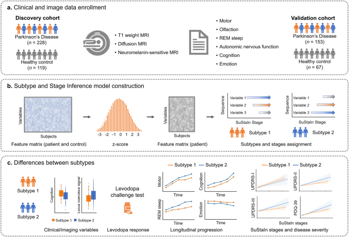 Here, we aimed to identify PD subtypes with distinct trajectories based on the above-mentioned data-driven method with multidimensional data, including comprehensive clinical evaluations and MRI features (diffusion tensor imaging and neuromelanin-sensitive MRI). These MRI measures are considered as sensitive imaging biomarkers for evaluating neurodegeneration of PD patients6. Furthermore, we fitted analogous multidimensional data from the Parkinson’s Progression Markers Initiative (PPMI) dataset into the SuStaIn model to test the repeatability of PD subtypes. Finally, we investigated the differences in clinical characteristics, imaging features, response to levodopa treatment, and longitudinal prognosis between these PD subtypes (Fig. 1).