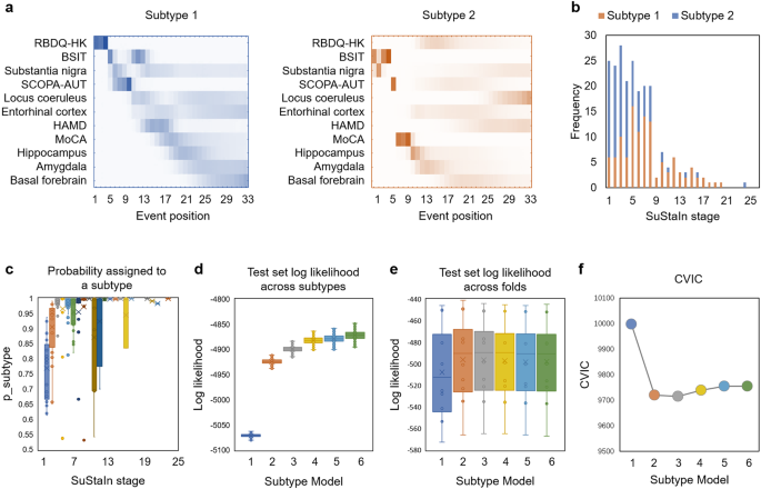 SuStaIn 모델은 시간적 및 표현형적 이질성을 분리하여 쉽게 접근 가능한 단면 환자에서 뚜렷한 진행 궤적을 가진 하위 유형을 식별하는 머신러닝 방법입니다. 한편, 이 모델은 각 환자에게 가장 적합한 하위 유형을 할당하고 해당 하위 유형 내에서 각 환자의 병기를 계산합니다. 이 모델에서 진행 궤적은 임상 또는 영상 특징의 이상 순서를 의미하며, 병기는 임상 또는 영상 특징의 누적된 이상 정도를 나타냅니다. 특정 유형의 모든 환자가 피질하핵에는 위축이 있지만 신피질에는 일부만 위축이 있는 경우, 수스타인 모델은 이러한 유형의 환자에서 피질하 위축이 신피질 위축보다 먼저 발생한다고 높은 신뢰도로 추론할 수 있습니다24. 따라서 피질하 위축과 신피질 위축이 모두 있는 환자는 순수한 피질하 위축이 있는 환자에 비해 질병 단계가 더 진행되었을 것입니다.