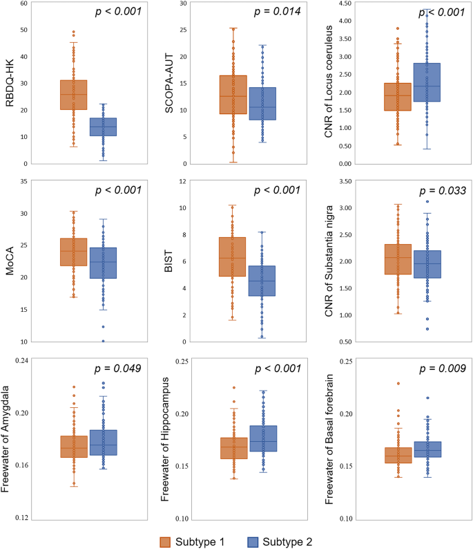 The two subtypes identified from the validation dataset were consistent with the subtypes determined from the discovery dataset. Subtype 1 patients had severe RBD symptom, while subtype 2 patients had significant poorer cognitive performance. It should be noted that the results obtained from free-water measures in the validation dataset were not entirely congruent with those obtained from the discovery dataset. We speculated that the lack of additional b0 with reverse phase-encode polarity contributed to the low sensitivity in detecting the neurodegeneration of PD. It is known that susceptibility-induced distortions could significantly reduce the accuracy of signal in small brain regions37. The findings from validation dataset also provided new knowledge about PD subtypes. Subtype 1 patients had faster rate of progression in motor symptom and global disease severity compared to subtype 2. This was consistent with previous studies that reported a poor prognosis in PD patients with RBD symptoms3,29. We also found that 3 patients with GBA mutations were grouped to subtype 1, and 1 patent with LRRK2 mutations was grouped to subtype 2. This finding was consistent the proposed “body-first” and “brain-first” phenotypes3,18. They considered that the pathogenic mechanism introduced by LRRK2 mutations may facilitate a “brain-first” subtype, whereas the GBA mutation carriers seem to be characterized by early, marked sympathetic denervation resembling more the “body-first” phenotype. Nonetheless, we acknowledged that the sample size for this analysis was small, and further validation is needed.