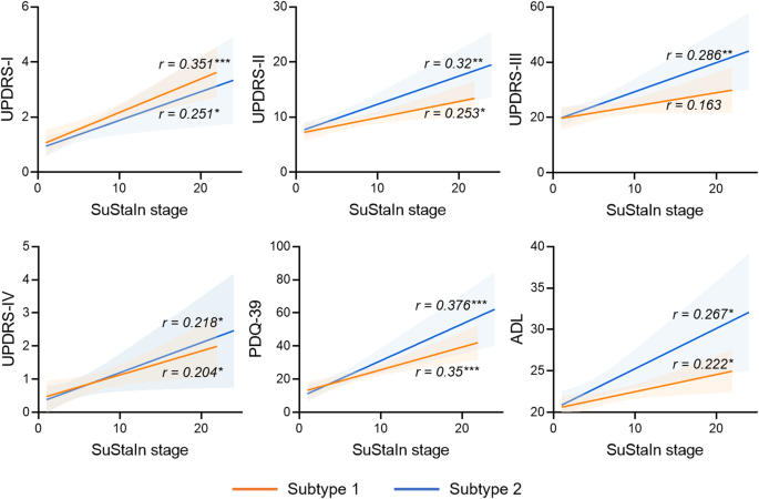 In addition to classifying patients into different subtypes, we assigned each patient for a SuStaIn stage. We found that SuStaIn stage was significantly correlated with UPDRS-I, UPDRS-II, UPDRS-III, PDQ-39, and ADL scores. Considering that these clinical variables are mostly used for evaluating disease severity from different dimensions, these results confirmed the rationality of using the SuStaIn model to assign patients into specific subtypes and stages.