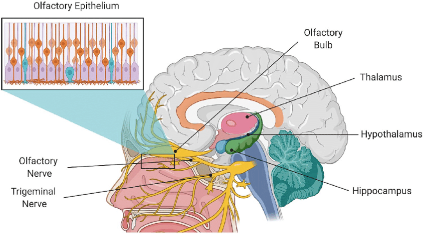 In addition to the main motor symptoms that characterize Parkinson’s disease (PD), olfactory dysfunction (OD) is a non-motor symptom that affects more than 90% of patients early in the course of the disease and has recently been accepted as a supportive diagnostic marker (Berg et al., 2015; Iannilli et al., 2017; Slabik and Garaschuk, 2023). The appearance of OD, combined with disorders of the digestive tract and cardiovascular and autonomic nervous systems, has led to the notion that PD is a systemic disease. If this multisystem disorder is defined in terms of α-synuclein-related pathology, it can be considered that it begins at least within the brain from the olfactory bulb (OB), the associated anterior olfactory nucleus, and the dorsal motor nucleus complex of the glossopharyngeal and vagus nerves, and only later involves the nigrostriatal motor complex (Rey et al., 2016). Olfactory loss is considered one of the earliest preclinical signs of neurodegenerative disease, appearing a decade or more before the onset of cognitive and motor symptoms. Exposure of the olfactory system to the external environment makes it more susceptible to mechanical damage and trauma, which can lead to degenerative neuroinflammation (Bathini et al., 2019). The inability to detect odors and the diminished perception of harmful factors in the environment increases the risk of pathogens and toxins leaking into the brain through the olfactory system (Rey et al., 2018). Standardized tests of odor-recognition ability are widely used and may serve as useful tools for cognitive-level diagnosis and accurate disease prediction in older adults (Devanand, 2016).