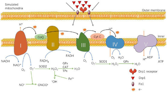 Activated Drp1 localizes to the mitochondrial membrane and interacts with the Drp1 receptor and Fis1 to form a fission complex that induces mitochondrial division. During electron transfer, molecular oxygen is formed as a superoxide by the action of complexes I and III, which is then enzymatically cleaved by SOD1 and SOD2 to form hydrogen peroxide. Hydrogen peroxide is broken down to water by a series of enzymes. However, in the presence of mitochondrial dysfunction or Fe2+, the intermediate products react with NO or form highly reactive hydroxyl radicals. Created with Microsoft PowerPoint 2021.