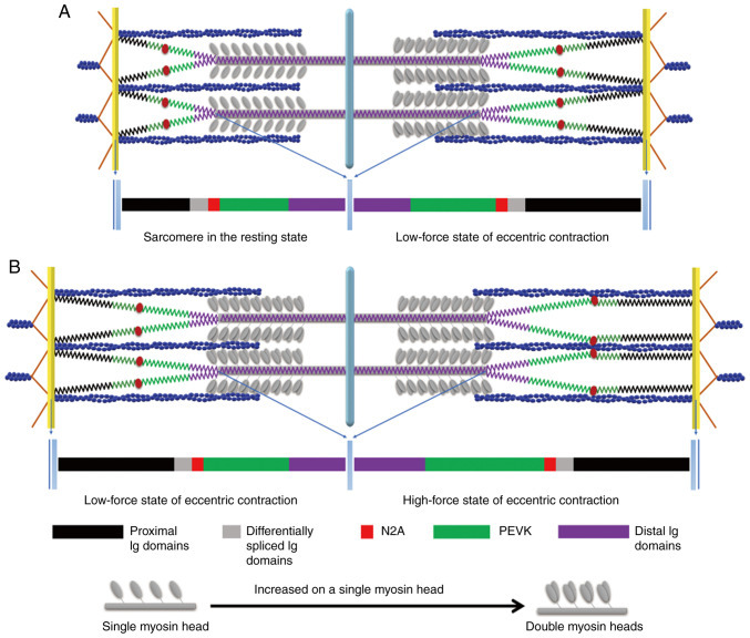Illustration of the eccentric contraction mechanism. In the resting state of the sarcomere (left half-sarcomere), only one myosin head is activated to form the cross-bridge during isometric and concentric contractions. However, during an eccentric contraction, the increased strain on a single myosin head may activate the second head, forming additional cross-bridges and prolonged detachment time. During the low-force stretch state of eccentric contraction [right half-sarcomere in (A) and left half-sarcomere in (B)], the titin proximal Ig domain undergoes stretching, causing the PEVK region to act as a spring and increase in length. In the high-force stretch state of eccentric contraction [right half-sarcomere in (B)], the increased Ca2+ concentration results in the Ca2+-dependent binding of titin N2A to actin, reducing the titin-free length and increasing titin stiffness. Simultaneously, Ca2+ binds to PEVK, preventing over-stretching and increasing its stiffness, which plays a protective role in the sarcomere. Data from a prior research of the authors were used to create this visualization (23). Ig, immunoglobin; PEVK, proline-glutamate-valine-lysine.