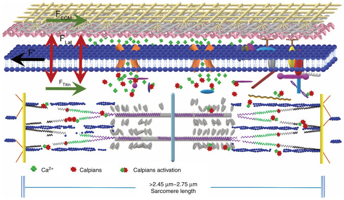 To summarize the aforementioned studies, the increase in titin stiffness, in the context of elevated cytoplasmic Ca2+ levels, does not result from binding to the thin filament. Instead, it is associated with Ca2+ binding to the PEVK element, preventing titin elongation and promoting the proximity of the distal end of titin to the central M-band of the sarcomere. Regardless of whether the mechanism underlying the increase in titin stiffness is fully understood or not, it is evident that titin, as the third filament, dynamically contributes to the regulation of passive force changes within the sarcomere by interacting with the thick and thin filaments (21,41,44). This role of titin complements the limitations of the two-filament sarcomere model (40), providing a more comprehensive explanation for the mechanism of an eccentric contraction.