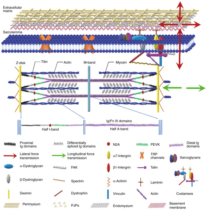 타이틴은 A 밴드의 미오신에 단단히 부착되어 I 밴드를 가로질러 자유롭게 이동한 후 Z 디스크의 액틴과 결합합니다. 녹색 화살표는 세로 힘 전달을 나타내며, 근섬유를 따라 근건 접합부를 통해 힘줄로 전파되는 것을 나타냅니다. 빨간색 화살표는 횡방향 힘 전달을 나타내며, 하나의 근섬유를 가로질러 EMC로 전달되어 궁극적으로 힘줄에 도달하는 것을 나타냅니다. Ig, 면역글로빈; Fn, 피브로넥틴; PEVK, 프롤린-글루타메이트-발린-라이신; TRP, 일시적 수용체 전위; PJP, 근막 주위 접합판.