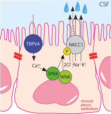 Fig. 6. TRPV4-mediated Ca2+ influx activates NKCC1 and leads to CSF hypersecretion. Polarized localization of NKCC1 and TRPV4 in the luminal membrane of the choroid plexus with tight junctions marked with red bars. TRPV4 activation leads to Ca2+ entry, which activates the WNK/SPAK signaling pathway, terminating in phosphorylation and activation of NKCC1. P indicates phosphorylation of NKCC1. TRPV4; transient receptor potential vanilloid 4 channel, NKCC1; Na+/K+/2Cl− cotransporter 1, SPAK; SPS1-related proline/alanine-rich kinase, WNK; with no lysine (WNK). The dashed arrow through NKCC1, terminating in a water droplet, indicates the cotransporter-mediated water transport via NKCC1.