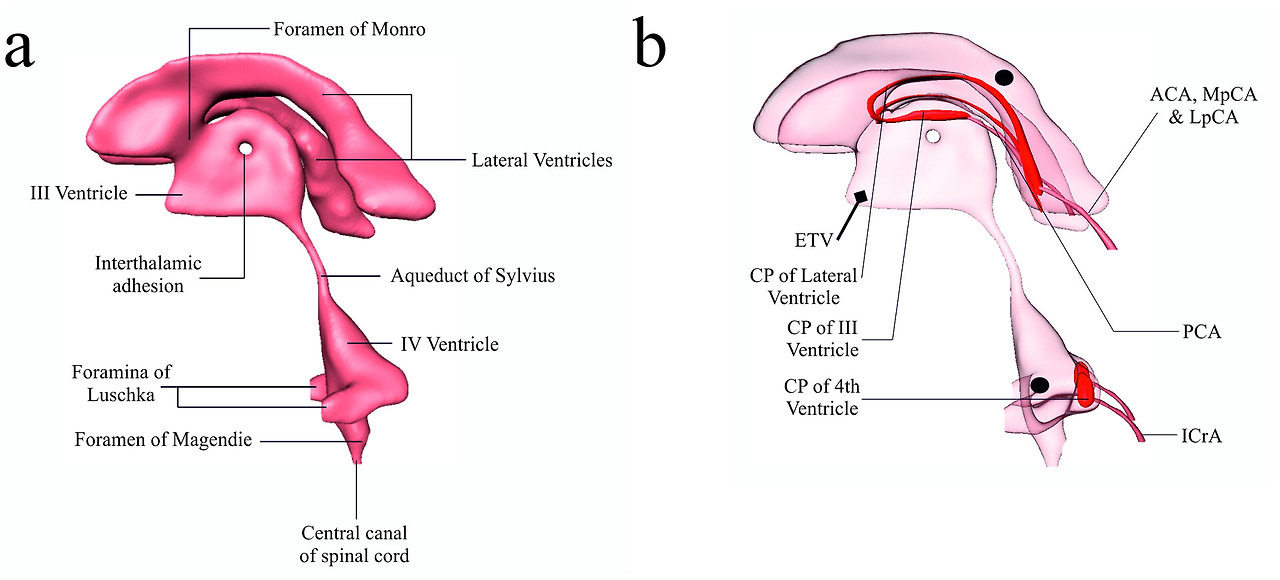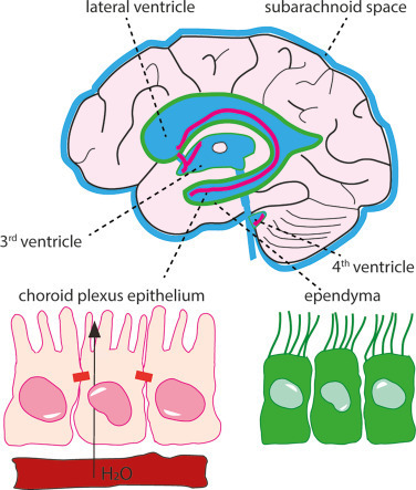 주로 네 개의 심실로 돌출된 혈관이 발달된 잎 모양의 구조물인 맥락막 신경총 [17], [18], [19], [20], [21]에서 유래하며,