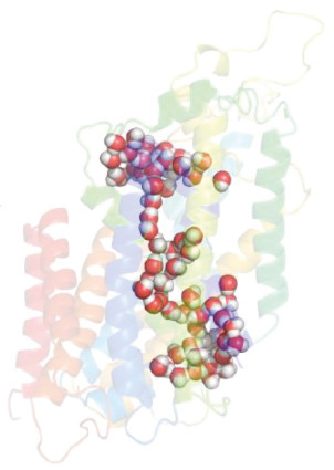 Fig. 3. Water permeation pathway observed in the cryo-EM structure of hNKCC1. Sphere representation of selected water molecules in an apparent permeation pathway containing nearly 100 water molecules though the hNKCC1, figure from Supplementary data in [81] with permission, http://creativecommons.org/licenses/by/4.0/.