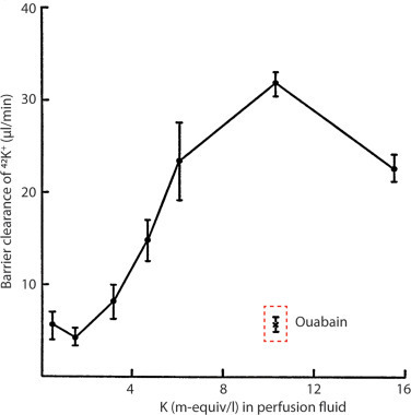 Fig. 4. The clearance of 42K+ from CSF into blood (barrier clearance) with varying [K+] in the ventricular/cisternal perfusion fluid in rabbits. Fluid of differing K+ concentrations (with inclusion of 42K+ as a tracer) was perfused into both lateral ventricles of anaesthetized rabbits and fluid subsequently collected from cisterna magna. Thereby the clearance of 42K+ from the CSF into the vasculature could be quantified and is illustrated as ‘barrier clearance’. The experimental point marked ‘ouabain’ indicates the K+ barrier clearance when the perfusion fluid contained 10−2 mM ouabain. Data are represented as mean ± SEM of 3–4 experiments. Figure adapted from [111], with permission.