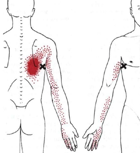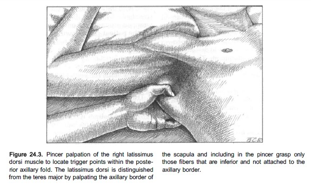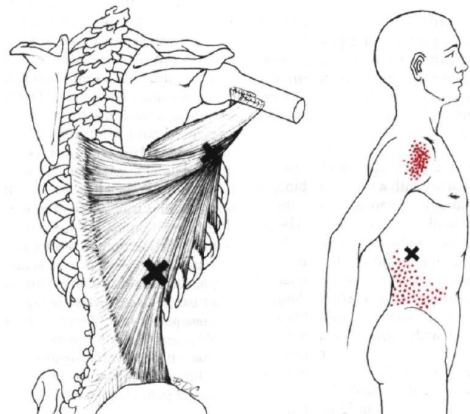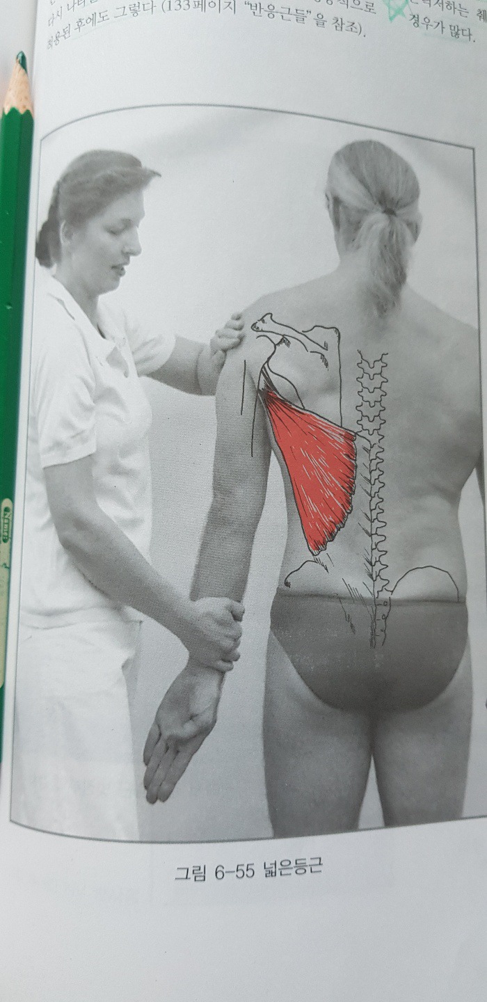- 광배근은 같은쪽의 상부승모근때문에 약하게 검사되는 경우가 있으므로 상부승모근을 잘 치료해야