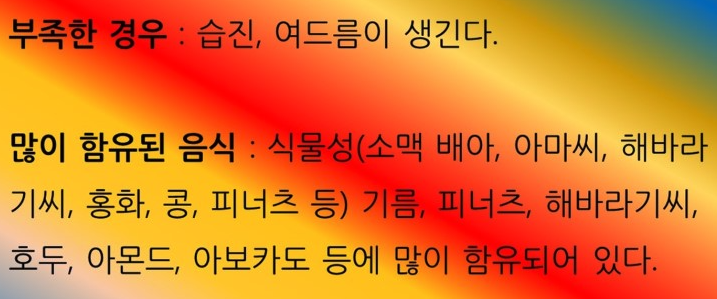 - 비타민F를 섭취하는 방법은 참기름, 들기름 등 여러 기름들. 우리가 자주 먹는 식물성 기름들에 많이 함유되어 있음.