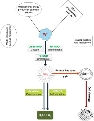 Before we consider how other radicals are derived from oxygen radicals, it is necessary to mention some normal physiological processes that lead to formation of oxygen radicals. Mitochondrial energy production pathway (MEPP) is a major source of oxygen radicals. These radicals are formed as oxygen is reduced along the electron transport chain which is located in the inner membrane of the organelle. Phagocytic leucocytes (white blood cells) especially neutrophils produce abundant of oxygen radicals through NADPH-Oxidase activity (O2 + e− → ∗O2−) as effort to destroy invading pathogens in defense or protection of the host organism.11 Oxygen-derived radicals are also produced as integral metabolites in cascades of enzyme catalyzed reactions. Exposure to ionizing radiation is well known to promote oxygen radical formation within biological systems through radiolysis (interaction of radiation and water).12 Hypoxia or/and hyperoxia condition in cells has been noted to generate numerous oxygen-derived radicals.13 Besides, a couple of therapeutic drugs such as acetaminophen have been reported to cause oxidizing effects on cells, consequently leading to formation of oxygen radicals through the activity of drug metabolizing enzymes known as cytochrome P-450 system.14