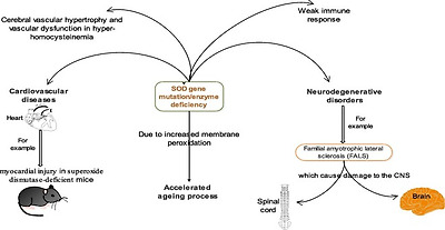 Fig. 4. Some pathological effects associated with SOD gene mutation or SOD deficiency.