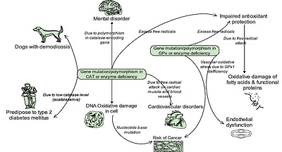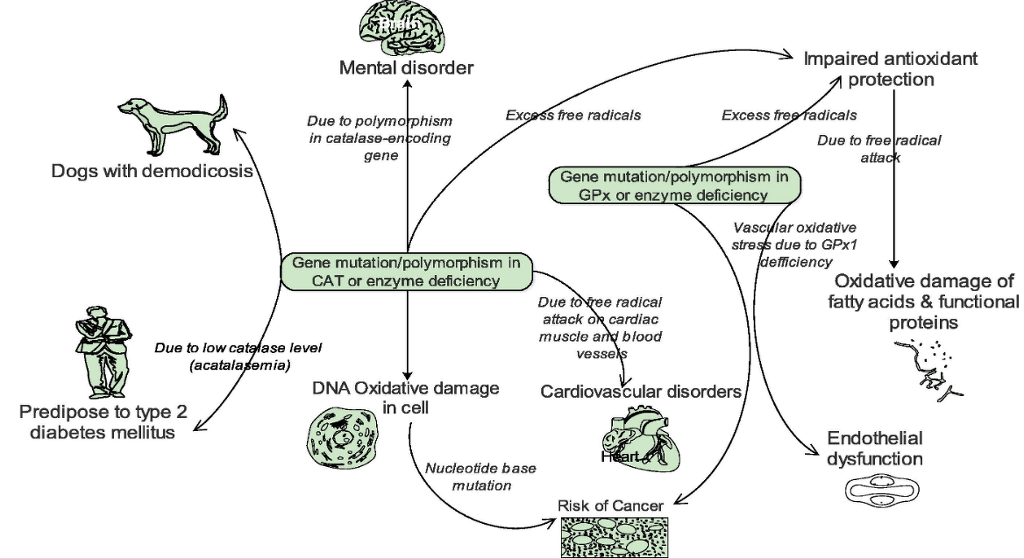 Zámocký and Koller associated oxidative DNA damage and subsequent risk of cancer susceptibility in individuals with genetic polymorphisms and altered gene expression/activity in catalase.40 Development of mental disorder has also resulted from polymorphism in the catalase-encoding gene.41 In addition, humans with low catalase levels (acatalasemia) are said to be more predisposed to type 2 diabetes mellitus (Fig. 5).39 and are sometimes affected by atherosclerosis and neoplasm. A significant reduction in catalase activity has been observed in dogs with localized and generalized demodicosis.42, 43