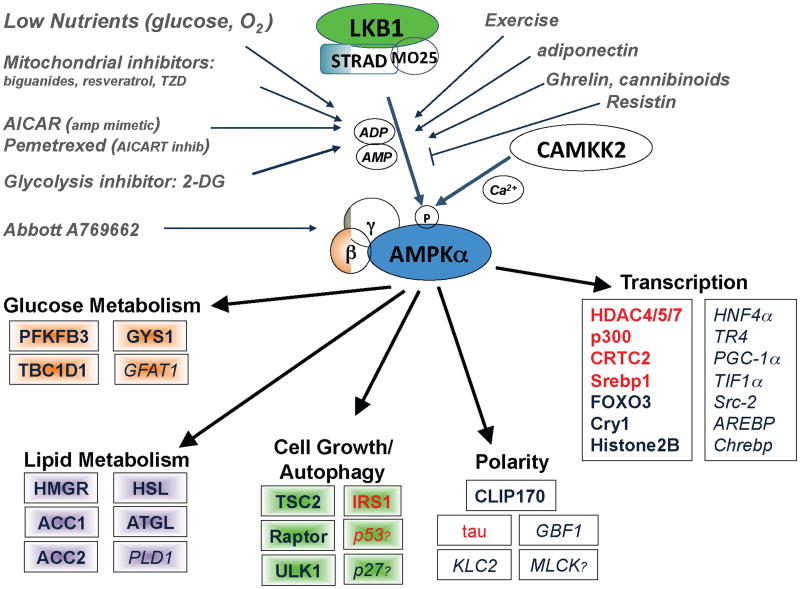AMPK is activated when AMP and ADP levels in the cells rise due to variety of physiological stresses, as well as pharmacological inducers. LKB1 is the upstream kinase activating it in response to AMP increase, whereas CAMKK2 activates AMPK in response to calcium increase. Activated AMPK directly phosphorylates a number of subtrates to acutely impact metabolism and growth, as well as phosphorylating a number of transcriptional regulators that mediate long term metabolic reprogramming. Shown are all the best-established substrates to date-those needing further in vivo examination are italicized. Question marks denote candidate substrates whose identified phosphorylation sites diverge from the established optimal substrate motif (which all the others conform to). A full lineup of the identified AMPK phosphorylation sites in these substrates in Supplemental Table 1. Substrates in red have been reported to serve as substrates of other AMPK family members (SIK1, SIK2, MARKs, SADs) in vivo in addition to being substrates of AMPK.