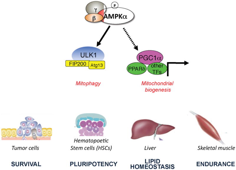 Activated AMPK acutely triggers the destruction of existing defective mitochondria via ULK1-dependent mitophagy and simultaneously triggers the biogenesis of new mitochondria via effects on PGC-1a dependent transcription. These dual processes controlled by AMPK have the net effect of replacing existing defective mitochondria with new functional mitochondria. This two-pronged control of mitochondria homeostasis by AMPK will have a number of physiological and pathological conditions where it plays a critical role, and a few are illustrated here.