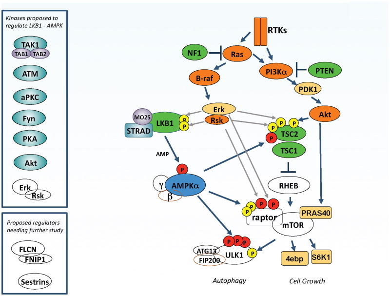 LKB1, the upstream kinase for AMPK, is the tumor suppressor gene mutated in Peutz–Jeghers syndrome (PJS), as well a significant fraction of sporadic lung cancers and cervical cancers. PJS patients share a number of clinical features with patients inheriting defective PTEN or TSC tumor suppressors, perhaps due to their control of common biochemical pathways, best understood currently being the mammalian target of rapamycin complex 1 (mTORC1) pathway. Extensive cross-regulation of the LKB1/AMPK pathway by the oncogenic Ras and PI3K pathways has been discovered, which may explain how these commonly mutated oncogenes also try to circumvent this endogenous tumor suppressor pathway. The ULK1/hATG1 kinase complex has emerged recently as a central node receiving inputs from both AMPK and mTORC1. A number of kinases that can phosphorylate specific residues in LKB1 or AMPK have been identified (upper inset), though the contexts in which most of these regulatory events occur is poorly defined at present, as is the functional impact of these phosphorylation events on AMPK signaling. The BHD tumor suppressor and its partner FNIP1, as well as the sestrin family of proteins, have also been implicated as being upstream or downstream of AMPK and mTOR depending on the context.