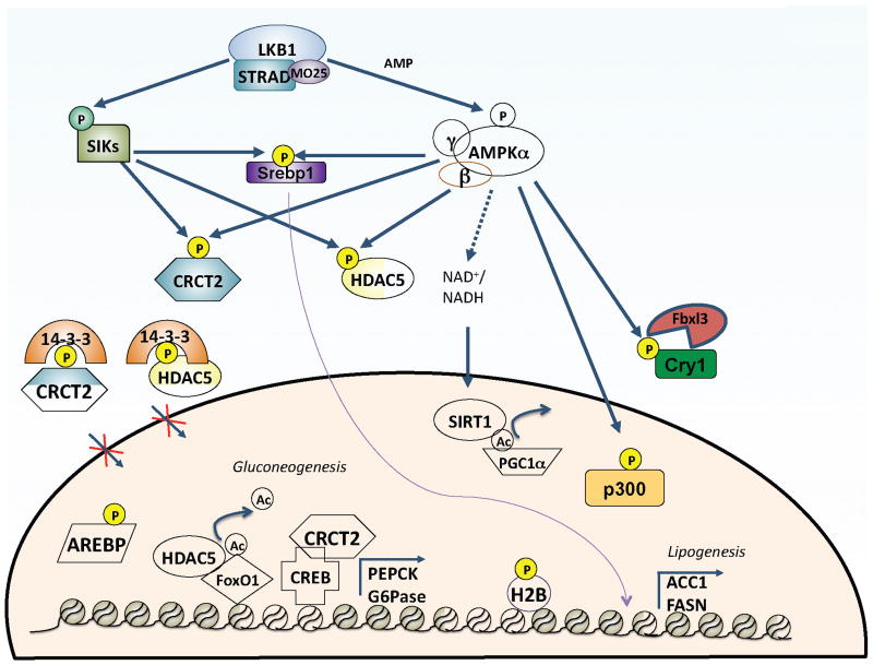 AMPK regulates several physiological processes through phosphorylation of transcription factors and co-activators. It shares substrates with its AMPK family related kinases to negatively regulate gluconeogenesis in the liver by phosphorylation and inhibition of the CRCT2 and Class IIa HDACs. These phosphorylation events induce binding to 14-3-3 scaffold proteins and sequestration of these transcription regulators into the cytoplasm. AMPK also regulates transcription factors via inducing their degradation (Cry1), preventing their proteolytic activation and translocation to nucleus (Srebp1), and by disrupting protein-protein (p300) or protein-DNA interactions (Arebp, HNF4a). AMPK has also been shown to directly control phosphorylation of Histone 2B on Serine 36 as well as indirectly controlling SIRT1 activity via increasing NAD+ levels.