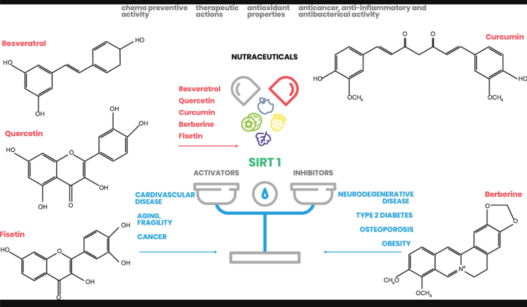 Figure 2 Nutraceutical action on SIRT1 expression. Natural substances have beneficial effects on human health by regulating SIRT1 action in different cellular processes (www.pubchem.ncbi.nlm.nih.gov).