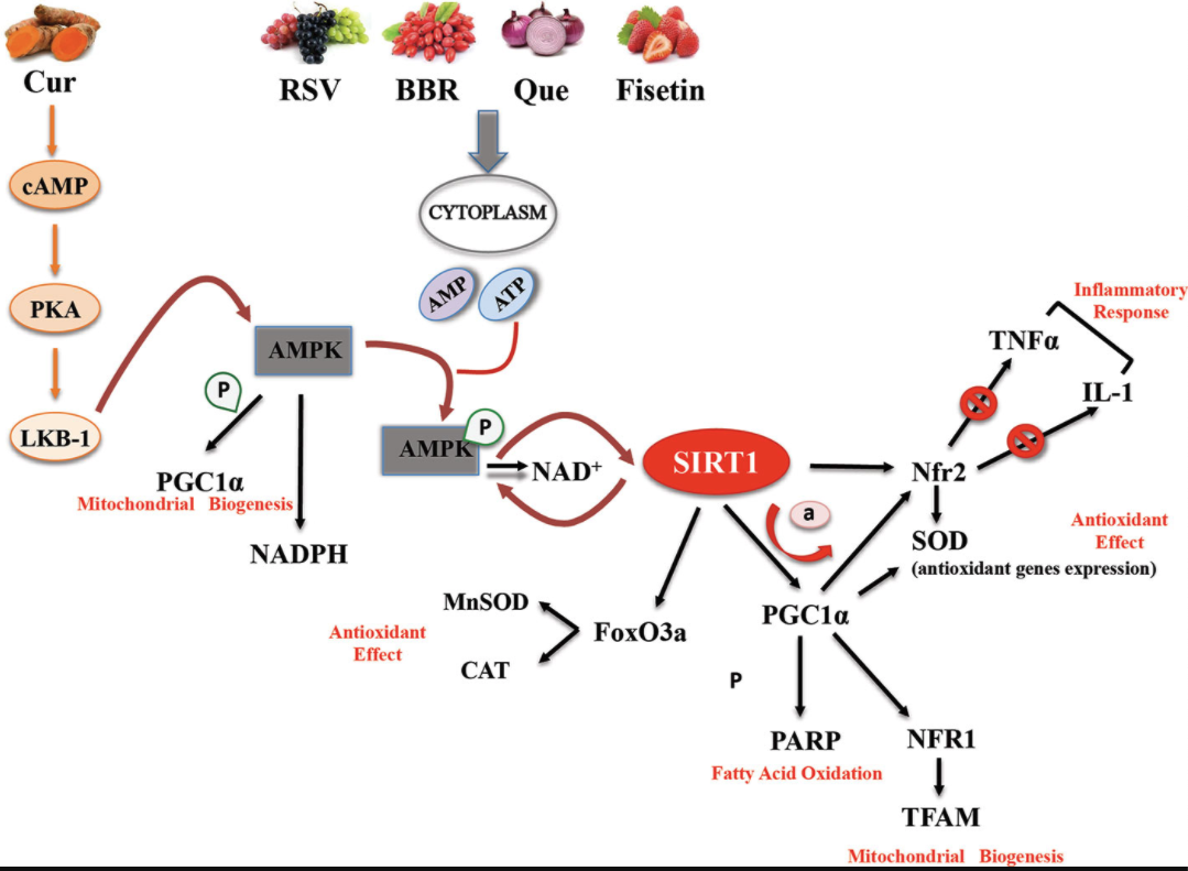 SIRT1, Sirtuin 1; HATs, Histone acetyl transferases; HDACs, Histone deacetylases; ROS, Reactive oxygen species; PPAR, Receptor peroxisome proliferator-activated receptor; NRF, Nuclear respiratory factor; TFAM, Mitochondrial transcription factor A; SOD, Superoxide dismutase; TNF-α, Tumor necrosis factor α; IAP, Apoptosis protein inhibitor; Bcl-2, B-cell lymphoma-2 family; MnSOD, Manganese superoxide dismutase; RSV, Resveratrol; Que, Quercetin; oxLDL, Oxidized LDL; BBR, Berberine; Cur, Curcumin; COX, Cytochrome c oxidase; T2D, Type II diabetes; NAFLD, Non-alcoholic fatty liver disease; CRM, Caloric restriction mimetic.