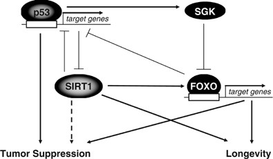 Feedback regulatory networks between FOXO factors, SIRT1, and p53 in longevity and tumor suppression. p53 is a tumor suppressor. FOXO factors have also been proposed to play a tumor suppressive role by inducing cell cycle arrest, apoptosis, and DNA repair. In addition, FOXO activity extends lifespan in invertebrates. In contrast, p53 has been shown to accelerate aging, in part by inhibiting FOXO factors activity and SIRT1 expression. The activation of FOXO factors in response to stress stimuli may overcome p53-dependent inhibition of SIRT1 and allow lifespan extension. SGK, serum and glucocorticoid inducible kinase