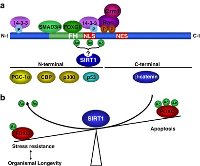 FOXO-binding partners. (a) A range of proteins has been found to interact with FOXO transcription factors. The specific regions of interaction for most proteins still need to be determined. The domains of FOXO factors that have been found to bind to specific protein partners are depicted. Proteins for which the exact region of interaction has not yet been determined are represented at the bottom of the figure. Ran, Ras-related nuclear protein; Crm1, exportin 1; PGC-1α, peroxisome proliferative-activated receptor-γ coactivator 1; CBP, CREB-binding protein; p300, E1A-binding protein p300. (b) SIRT1 belongs to the Sir2 family of protein deacetylase, which promotes longevity in invertebrates. SIRT1 binds to FOXO proteins and deacetylates several sites of FOXO factors. SIRT1 tips the balance of FOXO function towards stress resistance and away from apoptosis. As stress resistance is highly coupled with organismal longevity, one way by which SIRT1 may trigger longevity is by changing FOXO factors acetylation ‘signature’ and allowing stress resistance