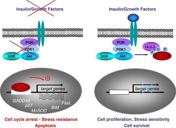 Since PI3K–Akt/SGK pathway negatively regulates FOXO transcription factors, it is not surprising that many functions of FOXO factors are opposite to the roles of Akt and SGK in cells. A large number of Akt and SGK critical functions in cells may be mediated by the repression of FOXO transcription factors.