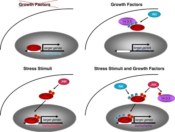 FOXO regulation by growth factors and stress stimuli. In response to growth factors, the PI3K/Akt pathway inhibits FOXO-dependent transcription through the phosphorylation and subsequent sequestration of FOXO factors in the cytoplasm. Stress stimuli are sufficient to overcome the cytoplasmic sequestration of FOXO factors. In response to stress stimuli, JNK phosphorylates FOXO factors, which causes the nuclear translocation of FOXO proteins. Although FOXO phosphorylation by JNK does not directly inhibit the binding of 14-3-3 proteins, JNK can phosphorylate 14-3-3 directly, thus releasing 14-3-3 substrates. JNK activity is sufficient to overcome Akt inhibition of FOXO factors and causes FOXO factors to transcribe a program of genes involved in stress resistance. We propose that a specific subset of target genes is transcribed under each condition. These specific transcriptional programs may dictate whether cells undergo cell cycle arrest, stress resistance, or apoptosis