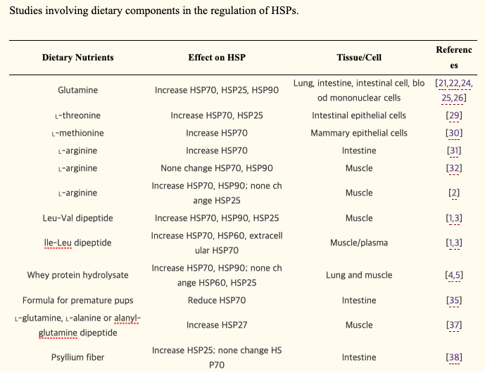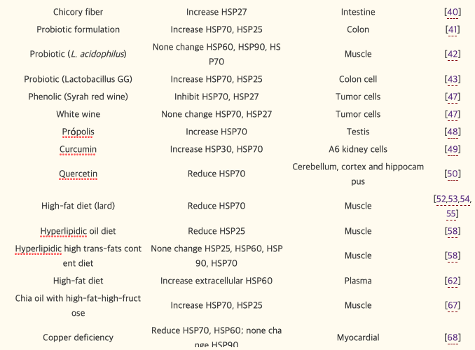 Table 1 summarizes the dietary components and their effects on HSPs.