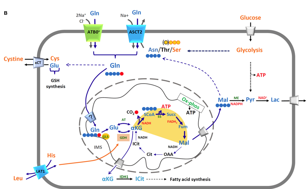 Figure 1. (A) Membrane transporters of glutamine and mechanisms of transport. The shape of the transporters reflects their asymmetry in membrane. Transporters are indicated by both conventional and SLC names. Different colors highlight different transport modes: in green symporters, in blue antiporters. Arrows represent direction of transported amino acids (blue) and ion (grey) fluxes; red arrow indicates possible Glutamine exit via LAT1 (SLC7A5). In the orange box, the list of cell pathways in which Glutamine is involved; in the light green box, the list of molecules synthesized from Glutamine. (B)Mitochondrial and cytosolic pathways responsible for energy production from Glutamine. In the scheme, Glutamine (Gln, blue) uptake occurs via membrane transporters ATB0,+ and ASCT2 through a sodium coupled process. The pathways are indicated as solid or dotted (in the case of multistep pathways) arrows (in blue those related to Glutamine, in black those involved in other pathways). Carbon atoms of Gln are depicted in blue–red filled circles; Gln enters mitochondria via an inner membrane transporter whose existence is still questionable (?): it could be a Glutamine or a Glutamate transporter depending on the actual sub-localization of Glutaminase enzyme (GLS). Carbon atom derived from Gln and released as CO2 is indicated in red, carbon skeleton of Malate and Asparagine (Asn) in blue, carbon skeletons of Serine (Ser) in orange circled in red and of Threonine (Thr) in orange circled in black. The truncated form of TCA is highlighted by a yellow hemicycle. ATP and reducing equivalent molecules produced by Glutamine metabolism are indicated in red. Leucine enters through LAT1 and allosterically regulates GDH in the orange box. Some metabolic pathways are indicated by names: GSH synthesis, fatty acid synthesis, Glycolysis, OX-phos. Membrane transporters of lactate and glucose in grey, xCT in light blue. Enzymes highlighted: GLS, Glutaminase; GDH, Glutamate dehydrogenase; AT, aminotransferases; SS, succinylCoA synthetase; ME, malic enzyme; IDH1, isocitrate dehydrogenase. Amino acids and other molecules involved in glutamine pathways (azure): Glu, Glutamate; α-KG, α-ketoglutarate; ICit, isocitrate; SCoA, succinyl coenzyme A; Succ, succinate; Fum, fumarate; Mal, malate; OAA, oxaloacetate; Cit, citrate; Pyr, pyruvate; Lac, lactate.