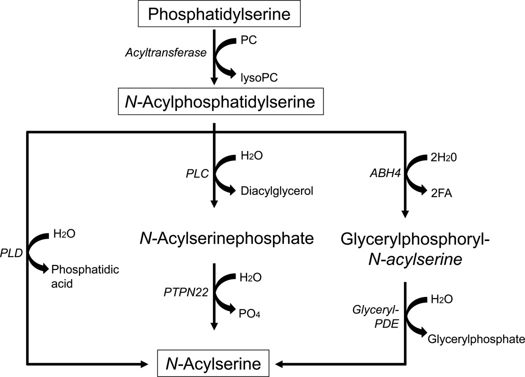 Hypothetical biosynthetic pathways involved in the formation of N-acylserine. This figure shows the likely mechanism for the synthesis of N-acylphosphatidylserine from PS which involves the transfer of the sn-1 fatty acyl residue from PC to the serine residue of PS mediated by a N-acyltransferase [116], and three potential pathways for the production of N-acylserine from N-acylphosphatidylserine; hydrolysis by phospholipase D (PLD) [116], hydrolysis by phospholipase C (PLC) followed by removal of the phosphate residue of N-acylserine phosphate by the PTPN22 phosphatase [123], or a double O-dacylation of N-acylphosphatidylserine by α,β-hydrolase ABH4 followed by glycerol-phosphodiesterase (PDE)-1-mediated hydrolysis [124].