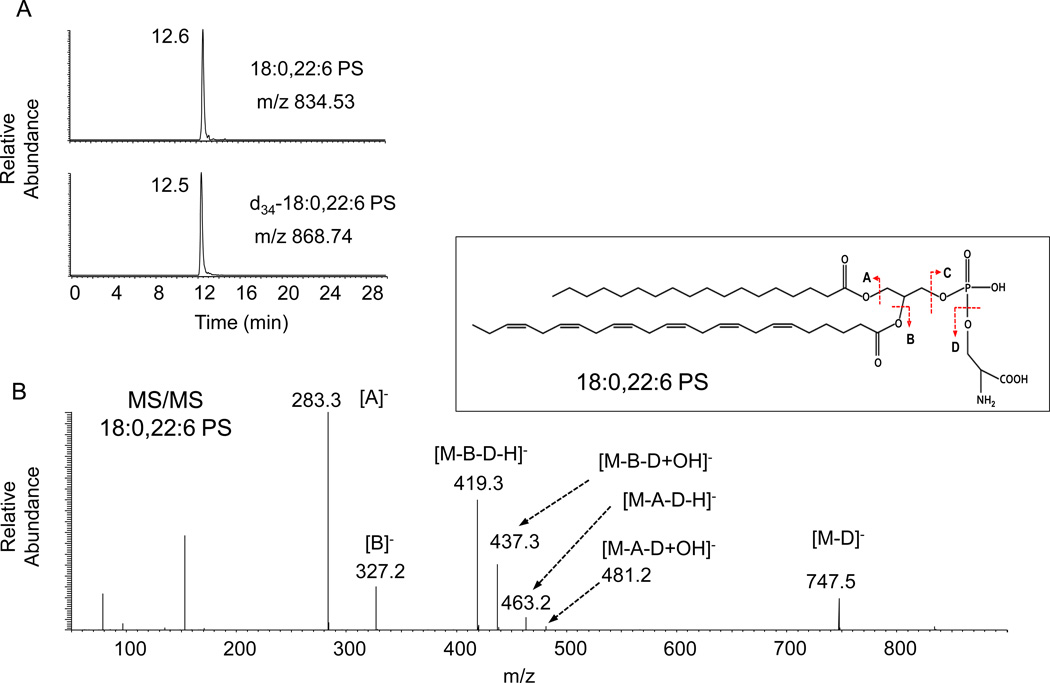 Detection of 18:0, 22:6-PS by isotope dilution mass spectrometry coupled with high performance liquid chromatography. Ion chromatograms reconstructed for [M-H]− (A) and tandem MS spectrum (B) demonstrates detection of 18:0, 22:6-PS in the plasma membrane. Quantitation is based on d35-18:0, 22:6-PS spiked into the biological samples as an internal standard. Extracted ion chromatograms for m/z 868.74 and 834.53 represents 18:0, 22:6- and d35-18:0, 22:6-PS, respectively. The fragments detected in the MS/MS spectrum indicate that the PS species contains 18:0 and 22:6 fatty acyl chains. Inset: the structure of 18:0, 22:6-PS and fragmentation in MS/MS.