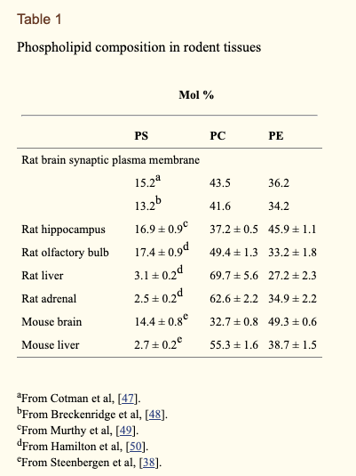 The PS content in human brain is maintained at the 13–14% level throughout the life [1]. As shown in Table 1 the synaptic plasma membrane, olfactory bulb and hippocampus of rats and mice contain markedly higher PS as compared to non-neuronal tissues such as liver and adrenal [38,47–50].