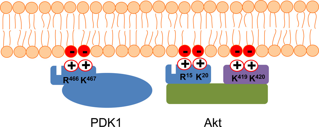 Schematic presentation of the specific interaction between anionic PS and basic residues in Akt and PDK1. The basic residues R466/K467 and R15/K20 that bind to PS (red circles) are located near the PIP3 binding pocket in PDK1 and Akt, respectively. K419 and K420 are located in the regulatory domain of Akt.