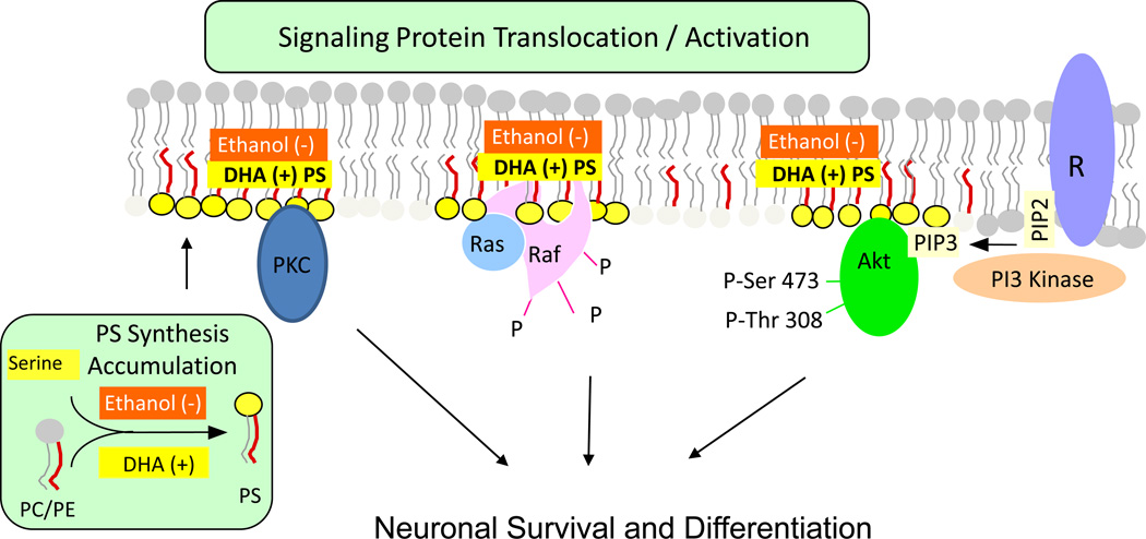 Activation of neuronal signaling pathways facilitated by PS. Activation of Akt, protein kinase C and Raf-1 requires translocation from the cytosol to the cytoplasmic surface of the plasma membrane. Translocation is initiated by specific stimuli, for example, growth factor-dependent PIP3 generation from PIP2 by PI3 kinase in the case of Akt. Binding to the membrane occurs in part through an interaction of these proteins with PS present in anionic domains of the lipid bilayer, activating the signaling pathways leading to neuronal differentiation and survival. DHA facilitates this mechanism by increasing PS production in neurons, while ethanol has the opposite effect because it inhibits the DHA-induced increase in PS production. R: receptor