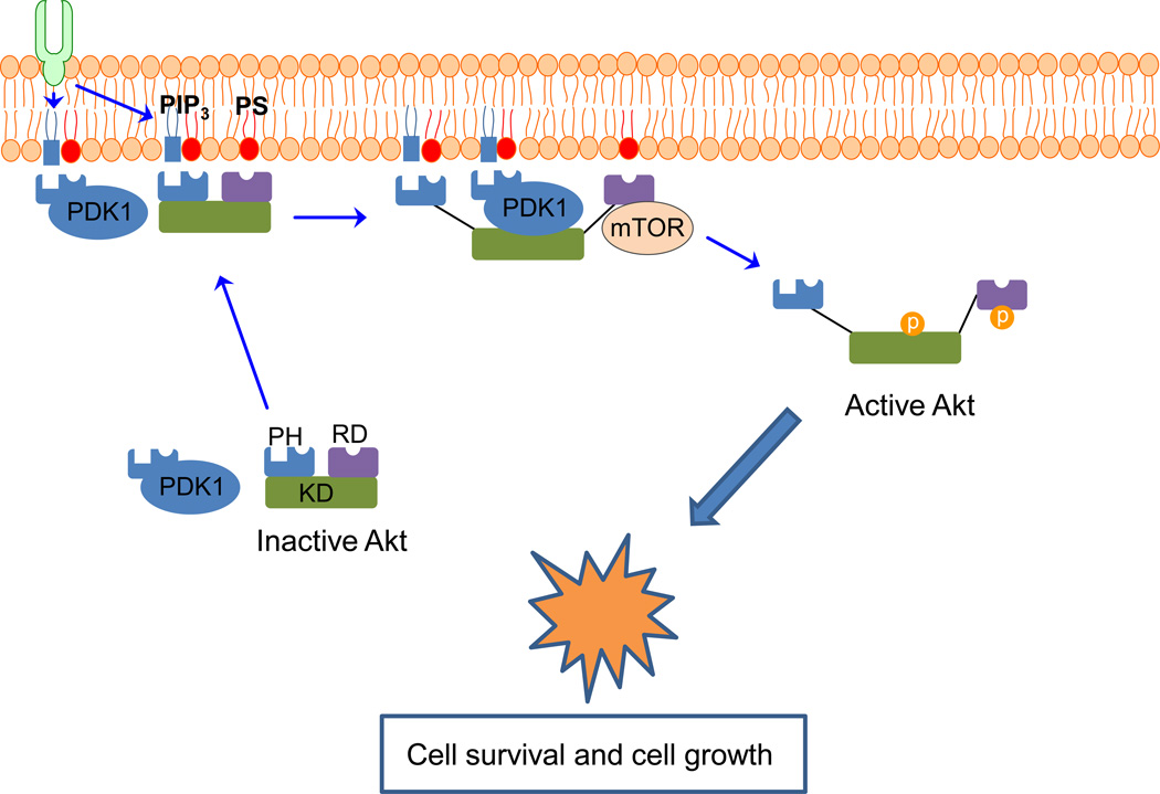 | Akt | Membrane binding of pleckstrin homology and regulatory domains, producing interdomain conformational change | Enables phosphorylation by PDK1 and mTORC2, activating Akt signaling pathway | [3] |