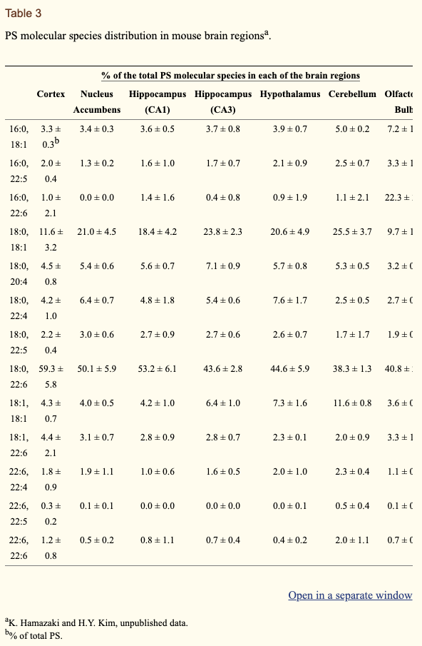 According to the positional distribution of the main fatty acids in bovine brain gray matter PS, 18:0 and DHA represent the most abundant fatty acids at the sn-1 and sn-2 positions, respectively [52]. Likewise, 18:0 and DHA are highly enriched at the sn-1 and sn-2 positions of PE, respectively. In contrast, the sn-2 position of PC contains only minor level of DHA, and 16:0 is more abundant than 18:0 at the sn-1 position. The molecular species analysis in the mouse brain by mass spectrometry also confirms the relatively high concentration of 18:0 and DHA in PS as shown in Table 3. The most abundant PS molecular species is 18:0,22:6-PS, which varies from 38% in the cerebellum to 59% in the cortex. There is little 16:0,22:6-PS except in the olfactory bulb where it accounts for 22% of the PS. Three species that contain DHA are di-polyunsaturated, and together, they comprise 2 to 4% of the PS in these regions of the mouse brain.