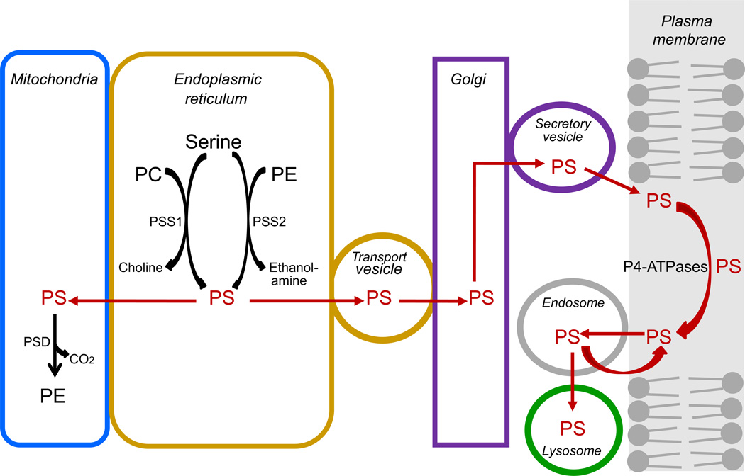 Phosphatidylserine (PS) is the major anionic phospholipid class particularly enriched in the inner leaflet of the plasma membrane in neural tissues. PS is synthesized from phosphatidylcholine or phosphatidylethanolamine by exchanging the base head group with serine in reactions are catalyzed by phosphatidylserine synthase 1 and phosphatidylserine synthase 2 located in the endoplasmic reticulum.
