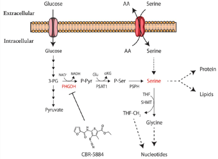 The serine synthesis pathway and downstream anabolic reactions of serine. Serine can be imported from the extracellular space by amino acid exchangers that trade extracellular serine for an intracellular amino acid (AA). Alternatively, serine can be synthesized de novo from glucose via the phosphoserine pathway in three reactions: first, PHGDH oxidizes 3-phosphoglycerate (3-PG) using an NAD C cofactor to give phosphohydroxy pyruvate (P-Pyr); second, phosphoserine aminotransferase (PSAT1) transaminates P-Pyr to phosphoserine (P-Ser) using glutamate (Glu) as the nitrogen donor; finally, phosphoserine phosphatase (PSPH) hydrolyzes P-Ser to serine. Serine is directly incorporated into proteins and the head groups of certain lipids. Serine hydroxymethyltransferases (SHMTs) catabolize serine to glycine and methylene tetrahydrofolate (THF-CH 2 ) thus charging the intracellular folate pool. Both serine-derived folate one-carbon units and glycine contribute to nucleotide synthesis. The newly identified compound CBR-5884 specifically inhibits PHGDH to abrogate serine synthesis.