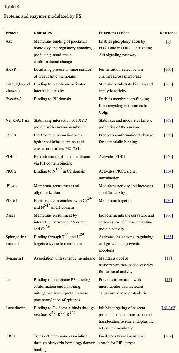 Activation of Akt, Raf-1 and protein kinase C signaling, which supports neuronal survival and differentiation, requires interaction of these proteins with PS localized in the cytoplasmic leaflet of the plasma membrane.