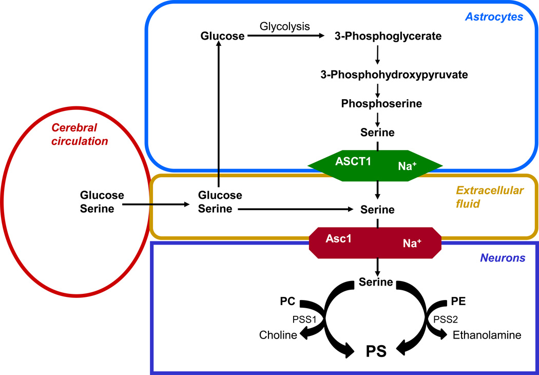 Pathways for providing serine to the brain. Serine can be taken up from the plasma or synthesized from glucose. The synthesis from glucose occurs in astrocytes where part of the 3-phosphoglycerate produced by glycolysis is converted to serine. The serine is transported out of the astrocytes by the Na+-dependent ASCT1 transporter. Serine derived from the astrocytes or plasma is taken up by the neurons through the Na+-dependent Asc1 transporter. The neurons utilize part of the incorporated serine for PS production catalyzed by either the PSS1 or PSS2 reactions.