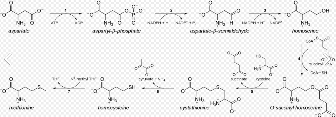 - In enterobacteria and a limited number of other organisms, succinate is used. The enzyme that catalyses the reaction is MetA and the specificity for acetyl-CoA and succinyl-CoA is dictated by a single reside.[11] The physiological basis for the preference of acetyl-CoA or succinyl-CoA is unknown, but such alternative routes are present in some other pathways (e.g. lysine biosynthesis and arginine biosynthesis).