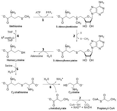 - (5) Cystathionine-β-synthase (an enzyme which requires the active form of vitamin B6, pyridoxal phosphate) combines homocysteine and serine to produce cystathionine. Instead of degrading cystathionine via cystathionine-β-lyase, as in the biosynthetic pathway, cystathionine is broken down to cysteine and α-ketobutyrate via (6) cystathionine-γ-lyase.