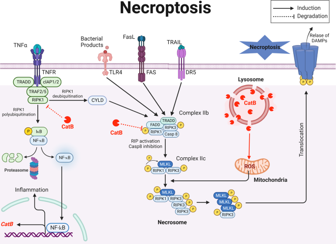 Necroptosis is a form of regulated cell death, which is induced by ligand binding to tumor necrosis factor family death domain receptors, pattern-recognizing receptors, and virus sensors. The common feature of these systems is the involvement of proteins, containing a receptor interaction protein kinase homology interaction motif mediating recruitment and activation of receptor interaction protein kinase 3, which ultimately activates the necroptosis executioner mixed lineage kinase domain-like. Subsequently, oligomerization of mixed lineage kinase domain-like disrupts the integrity of plasma membranes and causes cell death (Fig. 5). Several lines of evidence demonstrated that lysosomal membrane permeabilization resulting in CatB leakage-mediated mitochondrial ROS plays an indispensable role in the regulation of necroptosis [34, 35]. Besides that, there are few reports on CatB and necroptosis except for direct cleavage of receptor interaction protein kinase 1, demonstrating that CatB pulls the emergency brake on necroptosis [36].