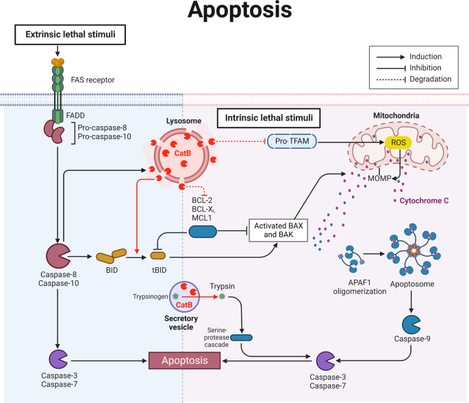 The extrinsic apoptotic pathway is activated by the binding of Fas ligand to the cell surface death receptor (FasR), which induces the activation of the caspase cascade. The intrinsic apoptotic pathway is activated by intracellular stress, which is initiated by BCL-2 family proteins (BAX/BAK). Mitochondria release cytochrome c. The binding of cytochrome c to APAF1 promotes apoptosome assembly, which recruits and activates caspase 9. Notably, leakage of CatB from the lysosome involves in TFAM degradation and Bid truncation, resulting in MOMP. Moreover, CatB in acidic secretory vesicles is involved in trypsin activation, which regulates the serine protease cascade, resulting in apoptosis. APAF1 apoptotic peptidase activating factor 1, BAK Bcl-2 antagonist/killer 1, BAX Bcl-2 associated X, apoptosis regulator, Bcl-2 B-cell lymphoma 2, Bid BH3-interacting domain death agonist, CatB cathepsin B, Fas apoptosis stimulation fragment, FasR Fas cell surface death receptor, MCL1 myeloid cell leukemia sequence 1, MOMP mitochondrial outer membrane permeabilization, ROS reactive oxygen species, tBid truncated Bid, TFAM mitochondrial transcription factor A.