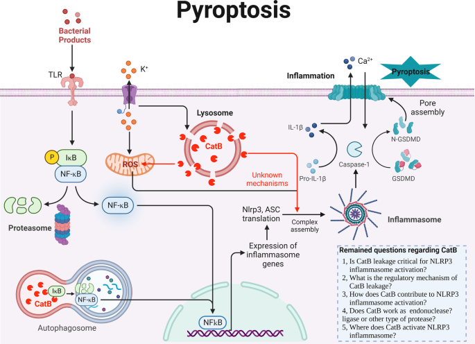 Activation of NLRP3 inflammasome in macrophages requires two steps: priming and activation. The priming step is provided by inflammatory stimuli such as TLR agonists, which induce NF-κB-mediated NLRP3 and pro-IL-1β expression. The activation step is triggered by PAMPs and DAMPs. Upon stimulation, NLRP3 oligomerizes and recruits ASC through homotypic PYD-PYD interactions and leads to helical ASC filament formation. Assembled ASC recruits caspase 1 and enables proximity-induced caspase 1 self-cleavage and activation, which in turn cleaves pro-IL-1β and GSDMD. GSDMD inserts into the membrane, forming pores and inducing pyroptosis. It has been demonstrated that CatB is a critical factor for NLRP3 inflammasome activation but the precise molecular mechanisms and cellular space are unclear. The remained questions regarding CatB are listed at the right-bottom of the figure. CatB cathepsin B, DAMPs damage-associated molecular patterns, GSDMD gasdermin, IL interleukin, IκB I kappa B kinase, NF-κB nuclear factor kappa-light-chain-enhancer of activated B cells, NLRP3 NACHT-, leucine-rich-repeat- (LRR), and pyrin domain (PYD)-containing protein 3, PAMPS pathogen-associated molecular patterns, ROS reactive oxygen species, TLR toll-like receptor.