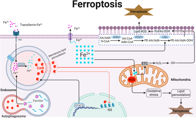 Ferroptosis is mainly caused by iron-dependent lipid peroxidation. Free Fe3+ forms a complex with extracellular transferrin, which binds to a TfR1 on the cell membrane and forms endosomes that are transported in the cell under endocytosis. In the cell, Fe3+ is catalyzed into Fe2+ by the enzyme STEAP3. Fe2+ can be pumped out through ferroportin which is located on the cell membrane. Excess Fe2+ generates ROS through Fenton chemical reaction, leading to the continuous accumulation of lipid ROS within the cell and the eventual development of ferroptosis. ROS can also interact with PUFAs on the lipid membrane to form lipid ROS. When a large amount of lipid ROS accumulates in the cell, it causes ferroptosis. Membrane lipid peroxidation of lysosome increases the permeability of the lysosomal CatB, which is capable to promote mitochondrial ROS production and degrades H3 in the nucleus. ACSL4 acyl-coenzyme A synthetase long chain family member 4, CatB cathepsin B, DMT1 divalent metal ion transporter 1, ETC electron transport chain, H3 histone 3, LOX lysyl oxidase, LPCAT3 lysophosphatidylcholine acyltransferase 3, PUFAs polyunsaturated fatty acids, ROS reactive oxygen species, STEAP3 six-transmembrane epithelial antigen of the prostate, TfR1 transferrin receptor 1.