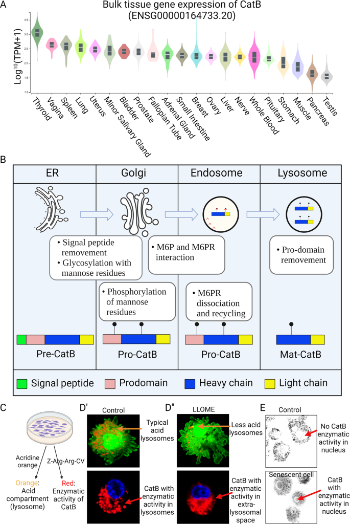 A CatB expression in various tissues. The data were obtained from the Genotype-Tissue Expression (GTEx) Project (https://gtexportal.org). Expression values are shown in TPM (transcripts per million), calculated from a gene model with isoforms collapsed to a single gene. B CatB maturation and lysosome-sorting pathway. C Methods to examine the lysosomal acid condition and CatB enzymatic activity. D’ Puncta signals (orange) of lysosomes with the acid environment and puncta signals (red) of CatB with enzymatic activity. D” LLOME increases the permeability of the lysosome membrane, resulting in a smaller number of acid lysosomes. LLOME-treated cells showed diffused CatB enzymatic activity. E Senescent cells showed CatB enzymatic activity in the nucleus but were not found in control cells.