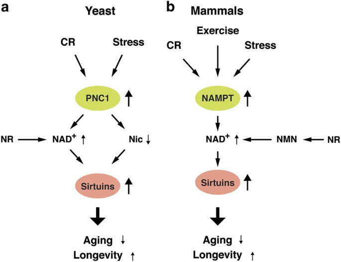 Mammals have developed a variety of mechanisms for adapting to changes in the environment, particularly changes in food availability and nutrient stress. Many of these nutrient-responsive pathways have broader effects on health and are emerging as regulators of fundamental mechanisms of aging. Fasting and dietary restriction, for example, have long been the most consistently effective intervention to slow various effects of aging and prolong the life span of otherwise healthy mammals. It is increasingly understood that the effects of fasting involve the actions of specific molecular signaling pathways. Cellular energy metabolites act as key mediators of many of these pathways, linking the external environment to changes in cellular function (43). Nicotinamide adenine dinucleotide (NAD), for example, accepts high-energy electrons from reactions in the catabolism of glucose and fatty acids and transfers them to acceptor molecules to either produce ATP or perform energetically demanding metabolic reactions. However, in its oxidized form (NAD+), NAD is also a cofactor for sirtuin enzymes and poly-ADP-ribose polymerase (PARP), both of which consume NAD in the course of removing acyl groups from and adding poly-ADP to proteins, respectively. Sirtuins and PARP thereby regulate cellular functions ranging from gene expression and DNA damage repair to fatty acid metabolism (134). During times of fasting, or relative scarcity of cellular energy, more NAD is in the oxidized state, and sirtuins and PARP can be more active.