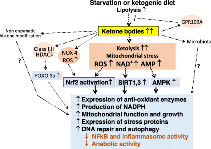 그러나 BHB 활용도는 미토콘드리아 산화 환원 상태에도 영향을 미칩니다. BHB의 이용률이 증가하면 NAD:NADH 평형이 NADH 쪽으로 기울어지고 코엔자임 Q의 산화 상태가 증가합니다(115). 피루브산에 비해 BHB의 연소 열이 높기 때문에 BHB는 미토콘드리아 양성자 구배에서 ATP 생산 효율을 높이고 활성산소 생성을 감소시킵니다(132). 자유 라디칼 생성의 변화는 p66Shc와 같은 미토콘드리아 자유 라디칼을 감지하고 이에 반응하는 신호 네트워크의 활동을 변화시킬 수 있습니다(33).